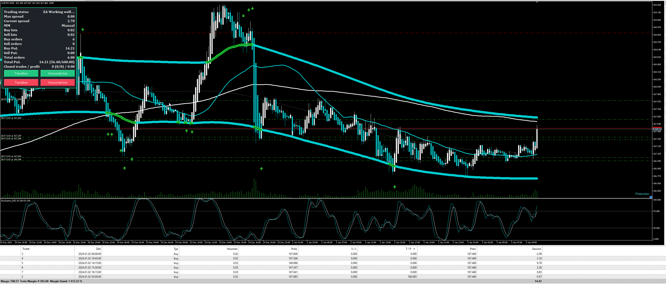 Neben Einzeltrades kann man diesen EA auch als Gridsystem konfigurieren. Hier ist natürlich gerade bei der Lotgröße Vorsicht geboten – wenn man das aber risikoarm macht, stellt diese Variante in Kombiation mit den anderen Sicherheitsmechanismen eine sehr gute Variante dar.
