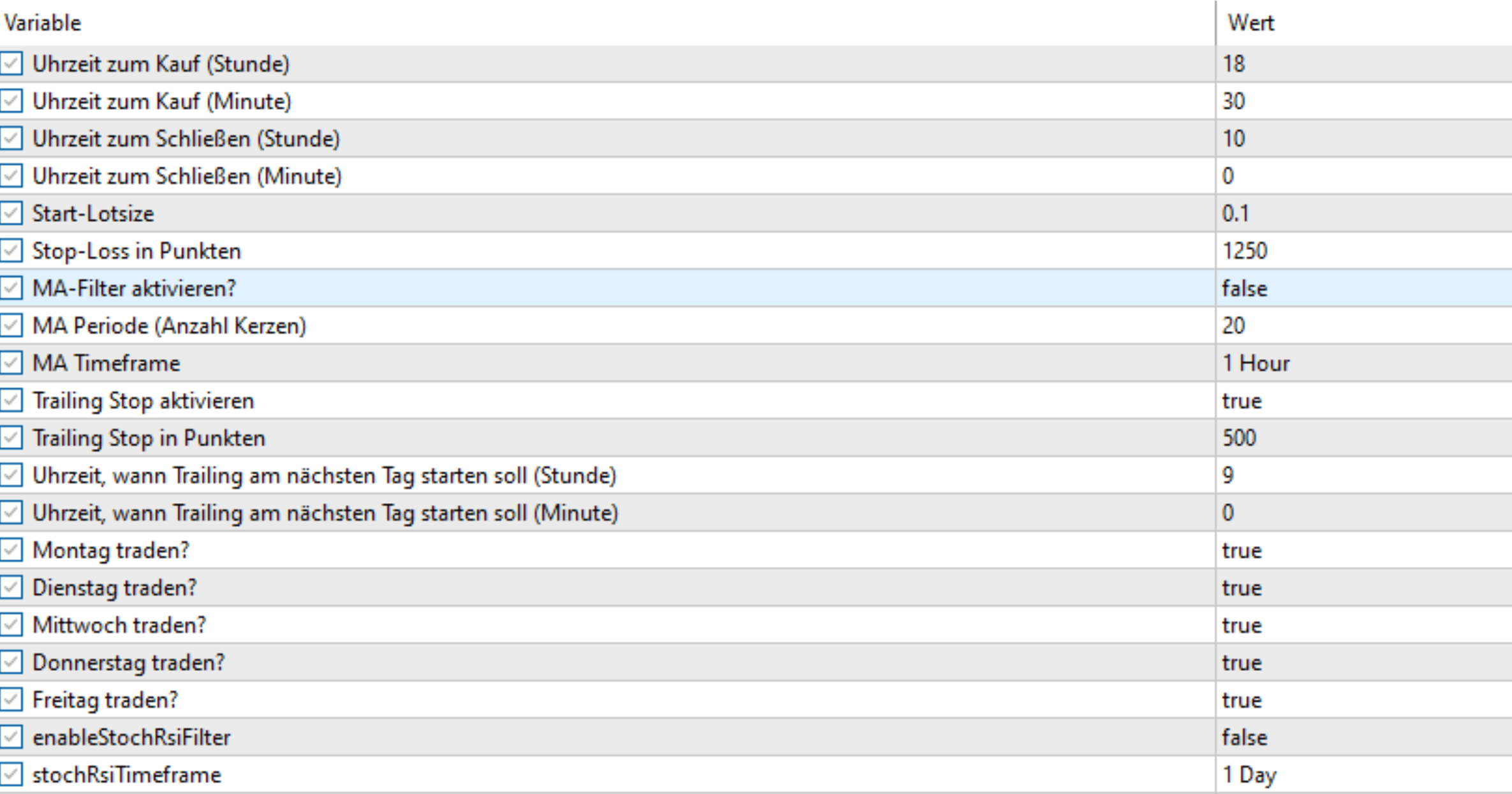 • Trailing Stop / Ausstieg: Um 08:00 Uhr (Uhrzeit anpassbar) aktiviert der EA einen Trailing Stop. Alternativ lässt sich der Trade auch automatisch zu einer bestimmten Zeit schließen. Das Ziel: Gewinne sichern, während die Chance auf ein größeres Plus besteht.
